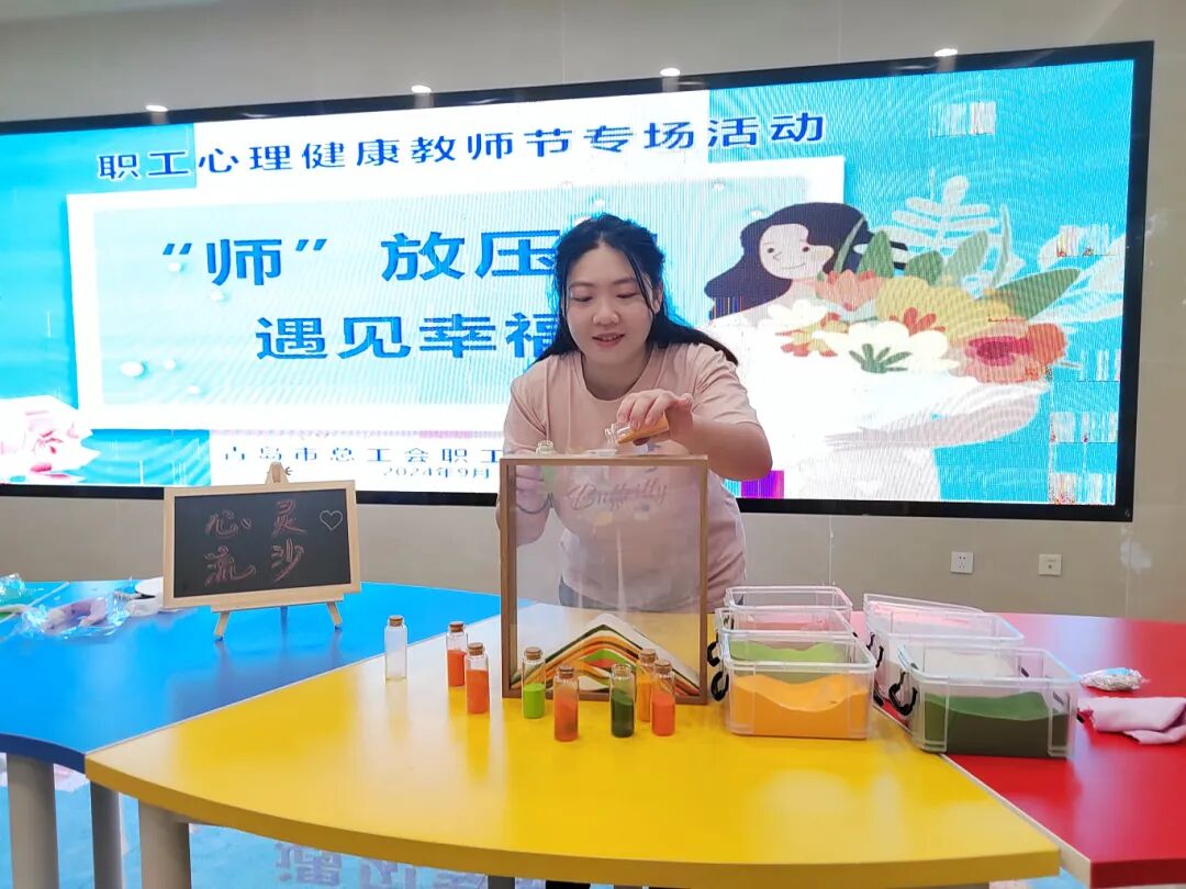 迎着金秋双节的到来,为关注教师心理健康、促进职工群体幸福感提升,青岛市总工会职工服务中心在“‘师’放压力,遇见幸福!”9月教职工主题月活动基础上,特别开展教师节专场活动,通过互动体验区、趣味工作坊、电影放映会以及专业咨询室等多个板块的精彩呈现,为青岛市实验幼儿园、青岛市技师学院等多个教育单位教职工打造了提升自我效能感的心灵体验平台。