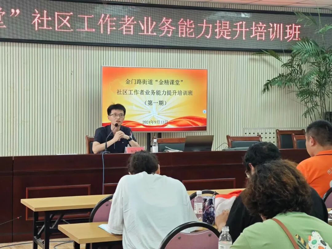 为提升社区工作者业务素养和能力水平,强化社区工作队伍建设,在社区治理中更好地发挥作用,9月13日上午,金门路街道举办了“金精课堂”社区工作者业务能力提升培训班(第一期)暨开班仪式,街道分管负责同志出席开班仪式并讲话,各社区社工、网格员代表40余人参加。