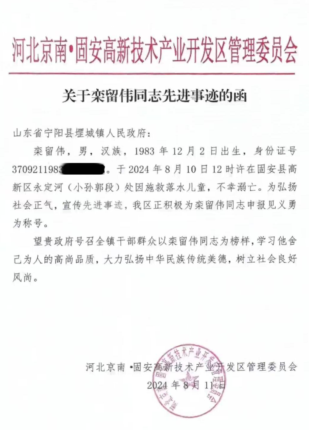 8月11日,河北省固安县高新区管委会给栾留伟的老家山东省宁阳县堽城镇人民政府发了《关于栾留伟同志先进事迹的函》,函中写道:8月10日中午,栾先生在固安县高新区永定河(小孙郭段)处因施救落水儿童不幸溺亡,为弘扬社会正气,宣传先进事迹,该区正积极为他申报见义勇为称号。