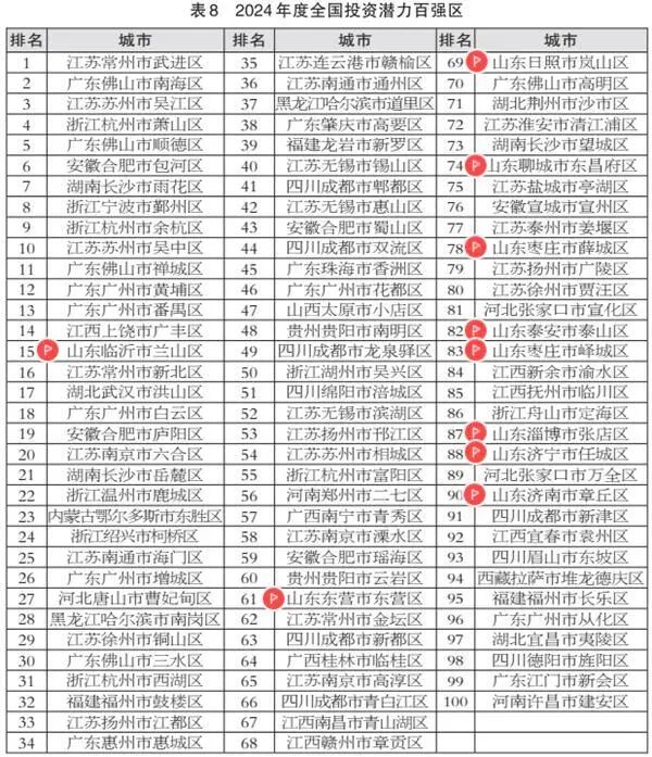 临沂市兰山区、东营市东营区、日照市岚山区、聊城市东昌府区、枣庄市薛城区、泰安市泰山区、枣庄市峄城区、淄博市张店区、济宁市任城区、济南市章丘区等10地入选2024年度全国投资潜力百强区。
