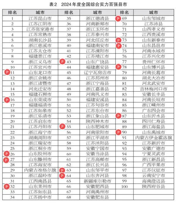 龙口市、荣成市、胶州市、滕州市、莱州市、广饶县、肥城市、邹平市、齐河县、邹城市、新泰市、昌邑市、博兴县、沂水县、禹城市等15地入选2024年度全国综合实力百强县市。