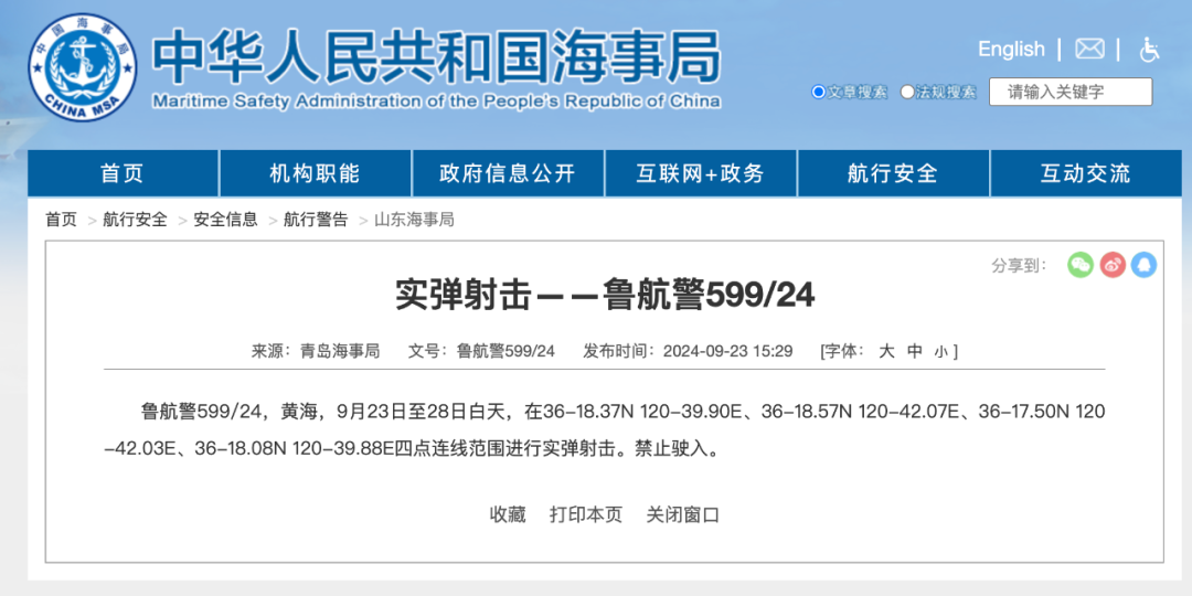 鲁航警599/24,黄海,9月23日至28日白天,在36-18.37N 120-39.90E、36-18.57N 120-42.07E、36-17.50N 120-42.03E、36-18.08N 120-39.88E四点连线范围进行实弹射击。禁止驶入。