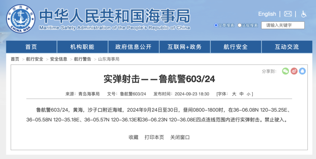 鲁航警603/24,黄海,沙子口附近海域,2024年9月24日至30日,昼间0800-1800时,在36-06.08N 120-35.25E、36-05.58N 120-35.18E、36-05.57N 120-36.13E和36-06.23N 120-36.08E四点连线范围内进行实弹射击。禁止驶入。
