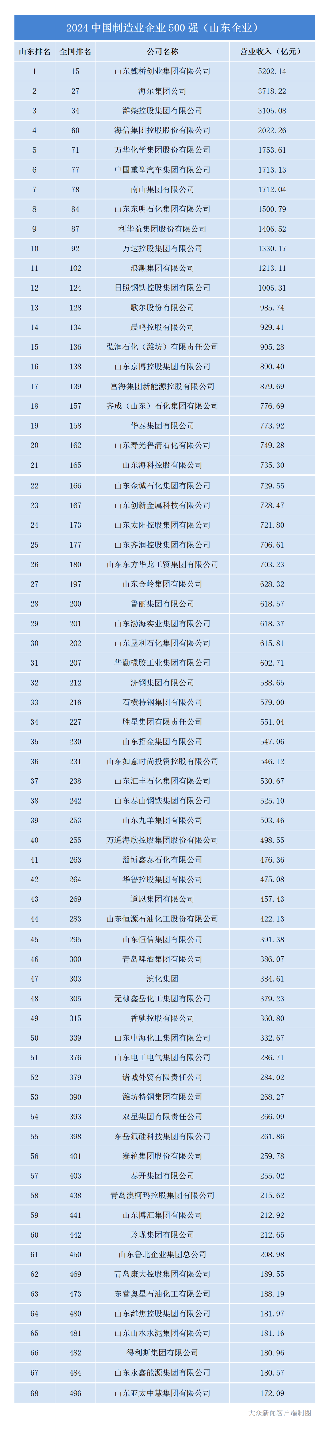 在近日举办的2024世界制造业大会上,中国企业联合会、中国企业家协会发布了2024中国制造业企业500强榜单。榜单前10位分别为:中国石化、中国宝武、中国中化、中国五矿、恒力集团、上汽集团、华为、中国一汽、荣盛集团和比亚迪。山东共有魏桥创业集团、海尔集团、潍柴集团等68家企业入选,总数位居全国第二位。名单如下: