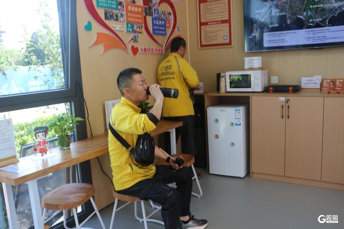 驿站不大,设施却很齐全。60平方米的休息区域内,充电宝、微波炉、饮水机、急救包等物品一应俱全。在这里,给手机充电,和工友分享送餐收获,“这里就像个家,温馨舒适。”来驿站休息的一位“骑手”说。