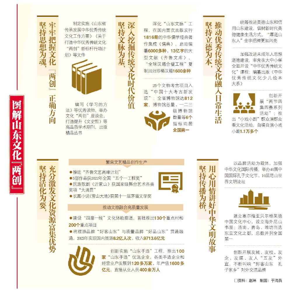 摸清文化家底,梳理传承脉络,山东跨步在前。2022年,印发实施《关于打造中华优秀传统文化“两创”新标杆行动计划(2022-2025年)》,文化“两创”工作全面起势,聚力打造7个新标杆。其中,赓续“山东文脉”被确定为重点文化工程,计划用10年左右时间,全面研究、保护、辑录和整理出版山东历代传世文献,同步建设齐鲁文献数字化文库和新媒体传播平台。