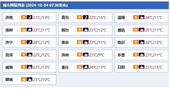 最高气温:菏泽、济宁和鲁西北地区24℃左右,其他地区22℃左右。