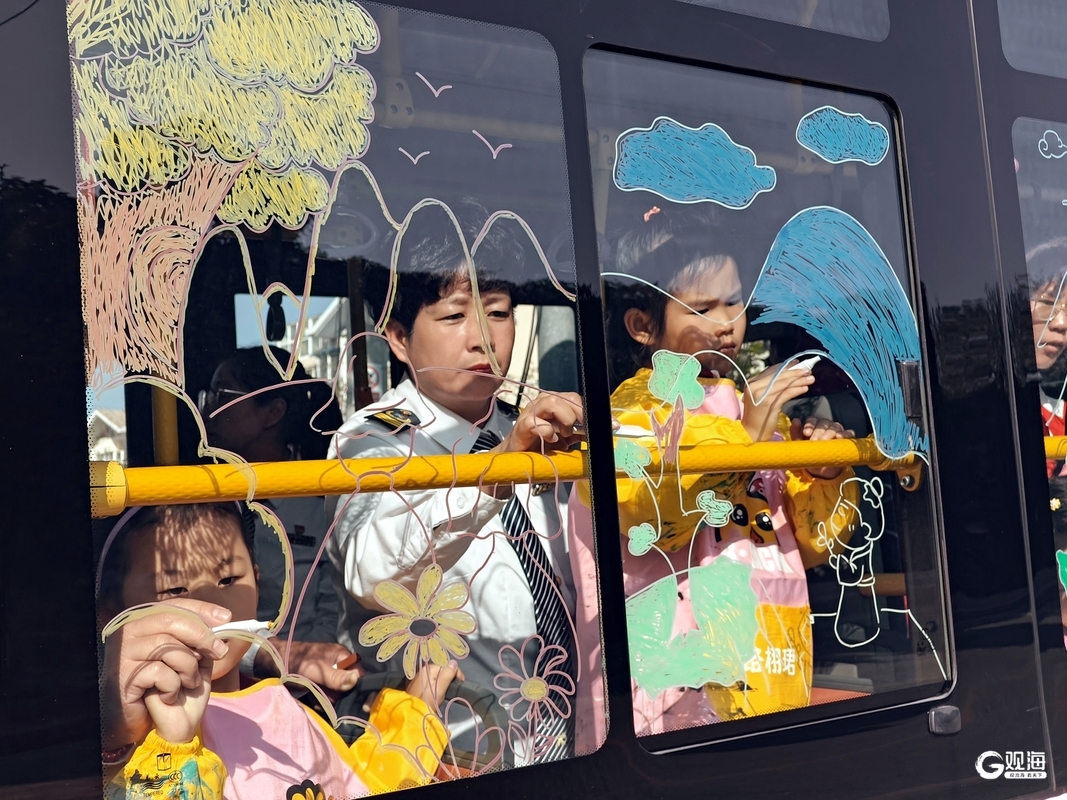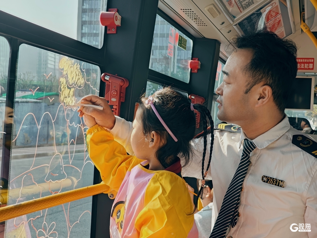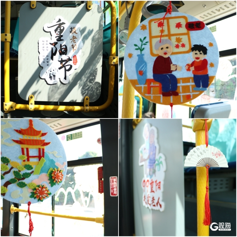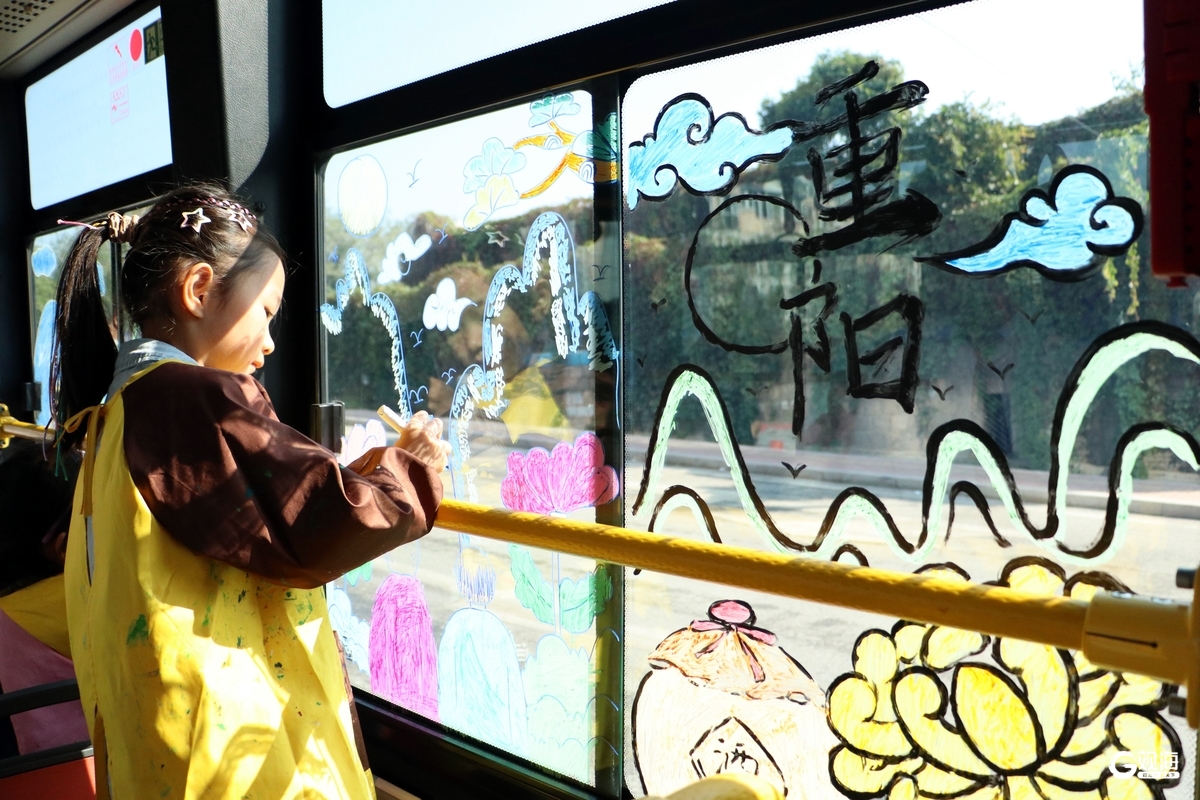 活动现场,观海新闻记者看到百果树幼儿园的小朋友们在公交驾驶员和老师的陪伴下,拿起画笔有序走进车厢,在车窗上勾勒出了夕阳暖菊、家人欢聚等“敬老情”的美好画面。随后,众人拿出重阳节祝福卡片和毛毡画,挂在了车厢两侧的扶手杆上。装饰过后,车厢里节日氛围十分浓厚。