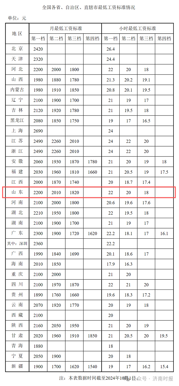 最新!山东最低工资标准公布 2024-10-15 20:44 山东工会 0 近日,人社部公布了全国各省、自治区、直辖市最低工资标准情况(截至2024年10月1日)。 山东省第一档月最低工资标准为2200元,第一档小时最低工资标准为22元。 责任编辑:岳文燕