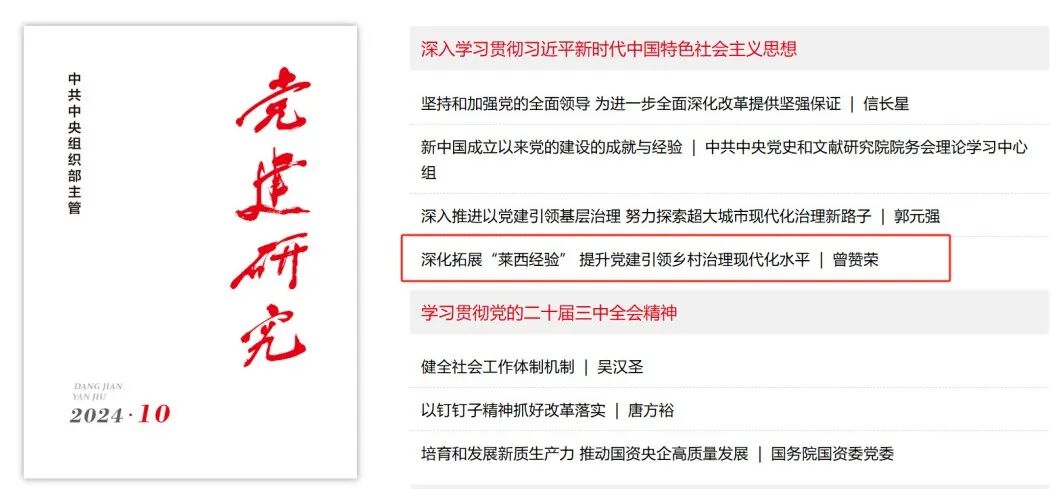 《党建研究》2024年第10期刊发山东省委常委、青岛市委书记曾赞荣署名文章《深化拓展“莱西经验” 提升党建引领乡村治理现代化水平》。