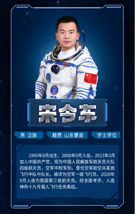 在10月29日举行的神舟十九号载人飞行任务新闻发布会上,蔡旭哲、宋令东、王浩泽被确定为“神十九”航天员。其中,1990年出生在山东曹县的宋令东入选前是空军飞行员,是我国第三批航天员,也是山东第二位飞上太空的航天员。