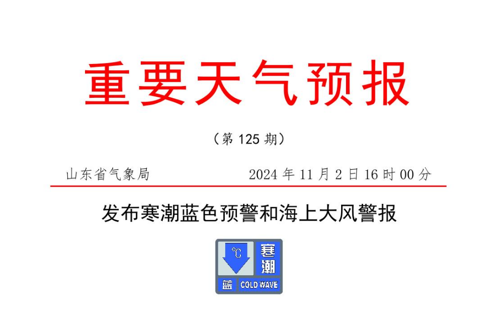 山东省气象台于11月2日16时00分发布寒潮蓝色预警和海上大风警报:受较强冷空气影响,预计3日夜间至5日我省将出现寒潮天气。鲁西北和鲁中地区过程降温幅度8~10℃,局部可达12℃左右,其他地区过程降温幅度6~8℃;最低气温出现在5日和6日早晨,鲁西北和鲁中地区0~2℃,有霜冻或冰冻,其他地区2~4℃,有霜冻或轻霜冻。