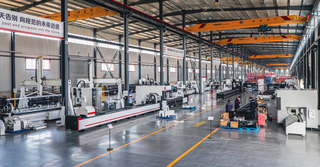 连日来,位于济南新旧动能转换起步区的济南鼎点数控设备有限公司里,4条组装调试产线开足马力,20余台重型激光切管机正在进行最后调试,10余台完成包装的设备整装待发。