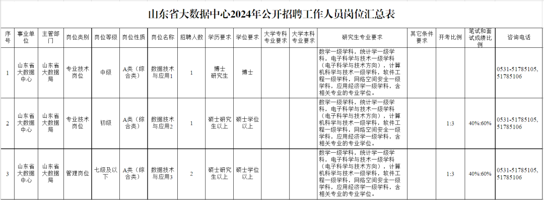 根据事业单位公开招聘有关规定,结合工作需要,山东省大数据中心面向社会公开招聘工作人员4名,其中,管理七级及以下人员2名,中级专业技术岗位人员1名,初级专业技术岗位人员1名。具体岗位及条件详见《山东省大数据中心2024年公开招聘工作人员岗位汇总表》。