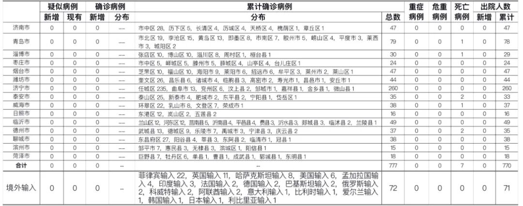 山东无新增本地疑似病例、确诊病例。累计报告确诊病例777例,死亡7例,治愈出院770例。