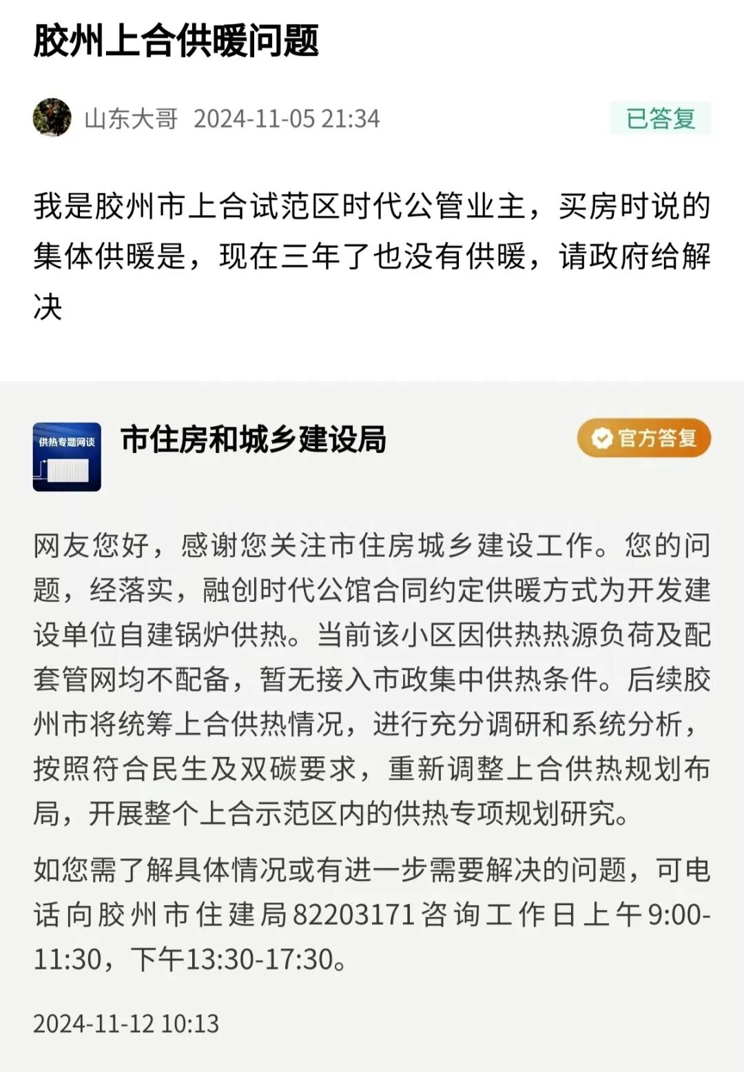 民生在线网友:即墨温泉镇恒大悦珑台四期全体业主要求今冬供暖,供热公司至今没有答复是否能供暖。