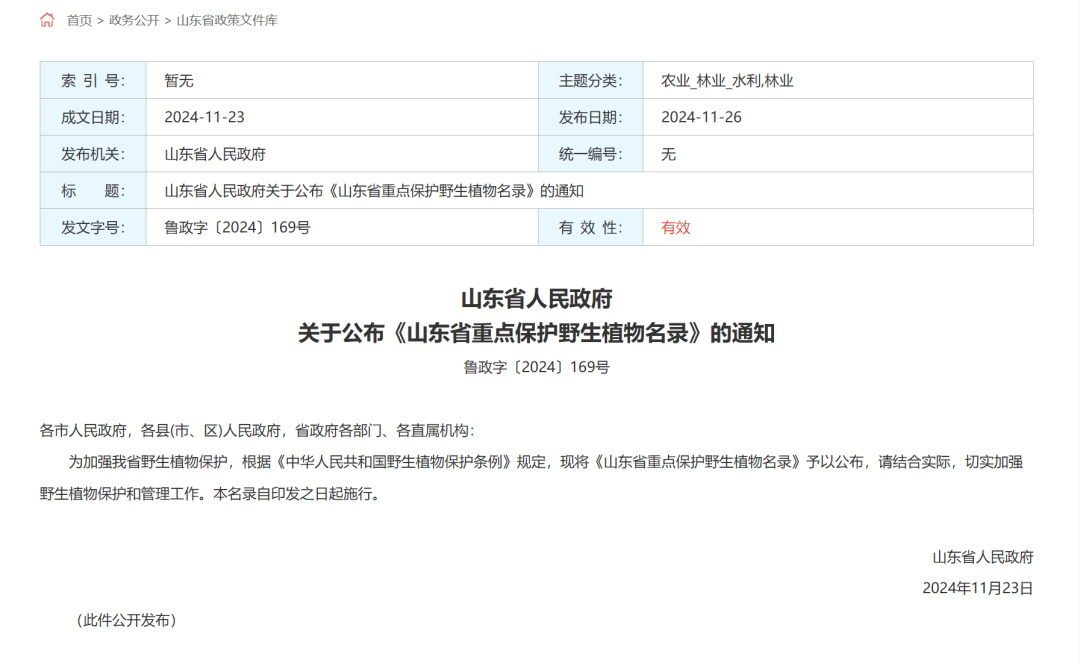 为加强我省野生植物保护,根据《中华人民共和国野生植物保护条例》规定,现将《山东省重点保护野生植物名录》予以公布,请结合实际,切实加强野生植物保护和管理工作。本名录自印发之日起施行。