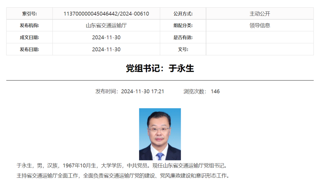 山东省交通运输厅网站“领导信息”一栏最新信息显示,于永生已任山东省交通运输厅党组书记。