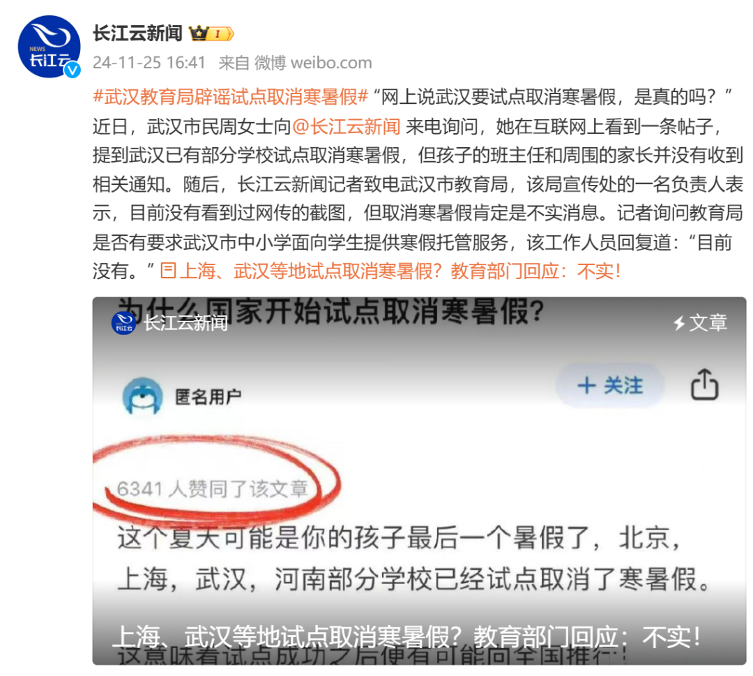 随后,记者致电武汉市教育局,该局宣传处的一名负责人表示,取消寒暑假肯定是不实消息。记者询问教育局是否有要求武汉市中小学面向学生提供寒假托管服务,该工作人员回复道:“目前没有。”