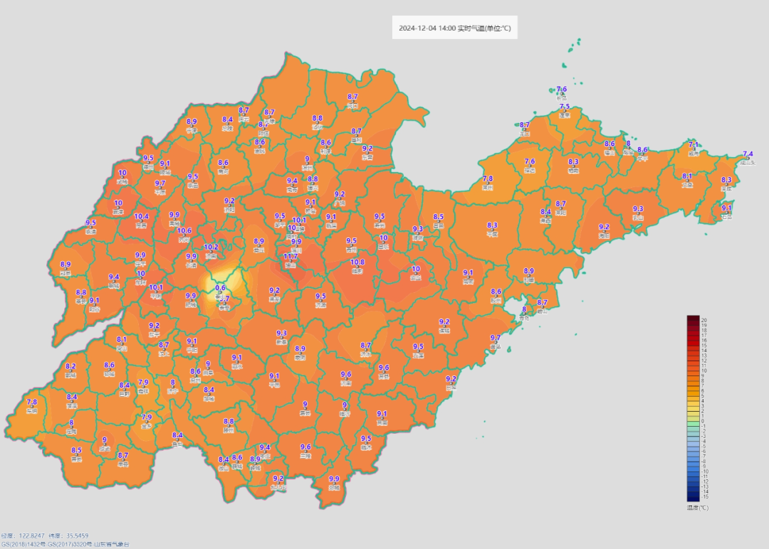 最高气温:鲁南地区11℃左右,鲁中山区和北部沿海地区7℃左右,其他地区9℃左右。