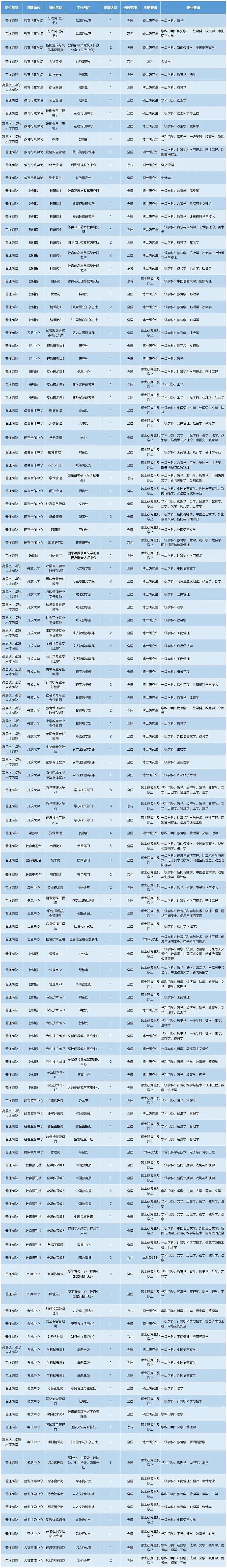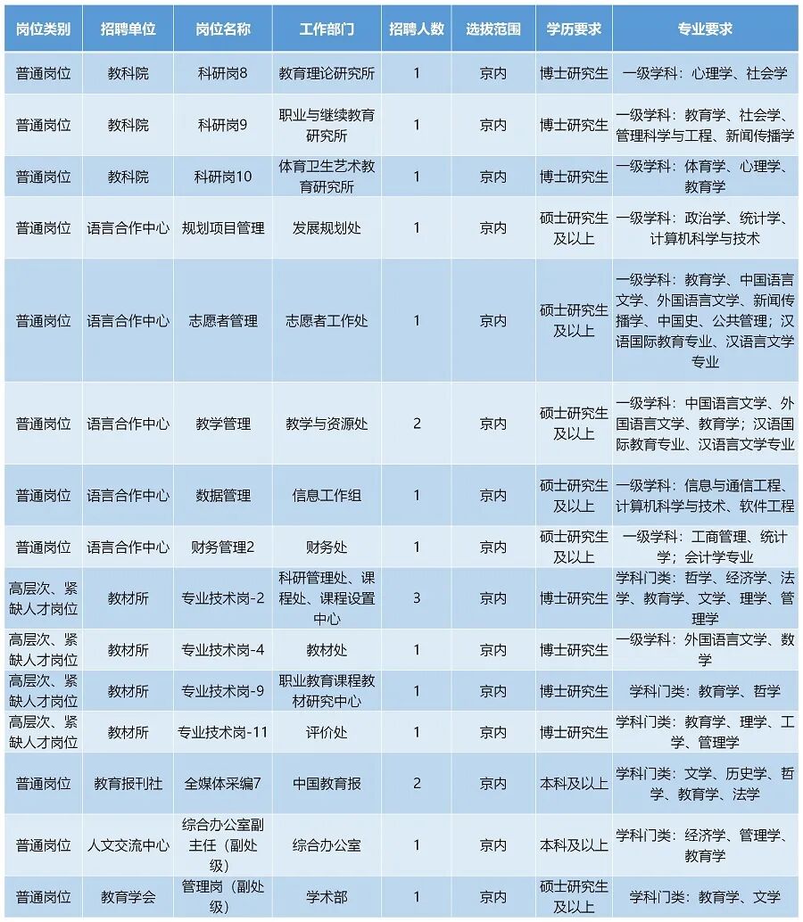 教育部直属事业单位2021年度公开招聘开始啦!本次共有22家单位面向应届毕业生公开招聘173人;6家单位面向社会在职人员公开招聘19人。本次招聘都有哪些岗位,各个岗位的要求是什么?看下表↓↓↓