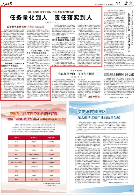 齐鲁网·闪电新闻12月12日讯 今天出版的《人民日报》第11版以《任务量化到人 责任落实到人》为题,聚焦东营精简考核指标,推行差异化考核机制。以下为报道全文: