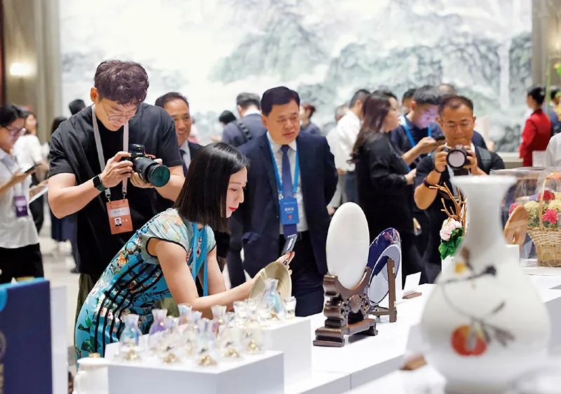 2024年7月10日,第十届尼山世界文明论坛在山东曲阜尼山开幕。本届论坛以“传统文化与现代文明”为主题,旨在“践行全球文明倡议、弘扬全人类共同价值、推动构建人类命运共同体”,还设置“全球挑战下的文明交流互鉴”等6个分议题。图为论坛开幕当日,展出的山东好品吸引宾客驻足欣赏。 山东省委宣传部供图 王世翔/摄
