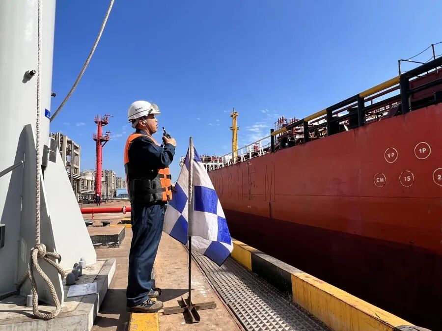 “打开氮气阀门进行试压,压力保持在6公斤,试压结果正常,中控室已具备作业条件,请联系海湾化学启泵装船。”调度孙振宇下达着生产指令。10:40,当船舱内传来货物装载的轰鸣声时,这场攻坚战成功达成预期目标,整个流程仅用时40分钟。