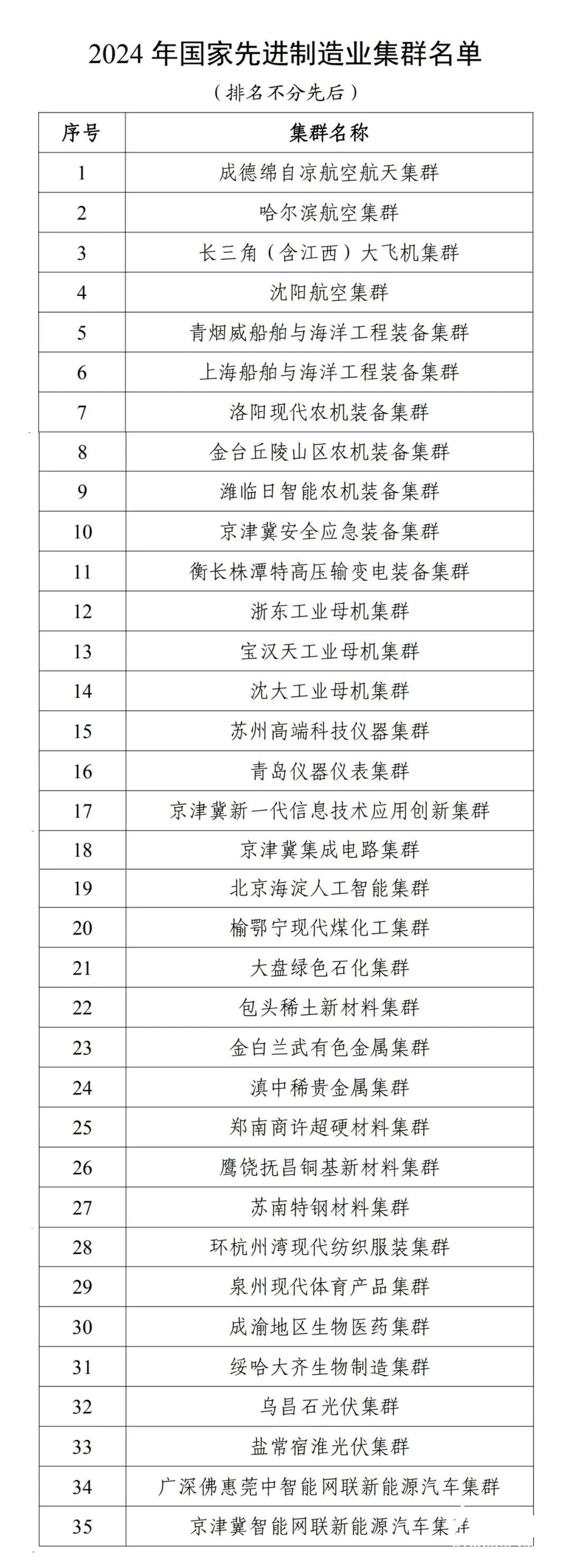 据介绍,为培育壮大先进制造业集群,工业和信息化部组织开展2024年先进制造业集群竞赛,经小组赛、综合赛评审并向社会公示,35个集群最终入选国家先进制造业集群。入选的国家级集群,需组织实施好培育提升方案,制定技术创新和产业发展路线图,明确引资引技引才重点,在强化协同创新、提升先进制造能力、培育优质企业、优化产业生态、完善治理体系等方面积极探索,提升集群综合竞争力。工业和信息化部将开展国家级集群发展水平监测评估,建立集群综合竞争力评价和动态调整机制,支持优势领域率先打造一批有世界影响力的先进制造业集群。
