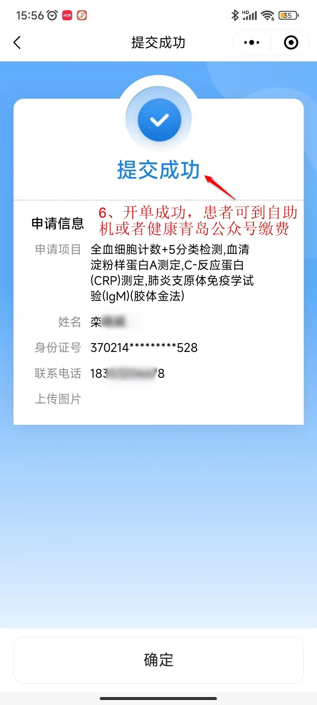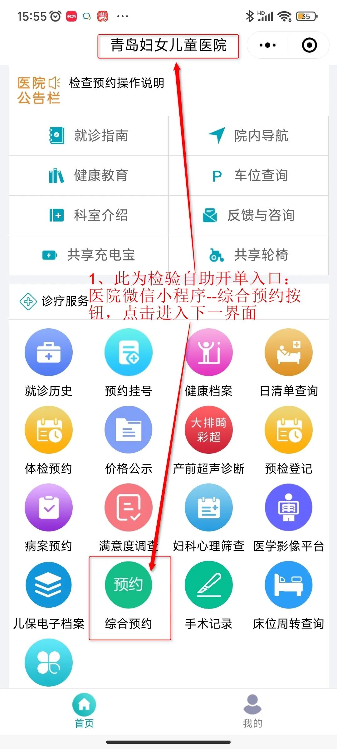自助检验项目在“青岛市妇女儿童医院”微信小程序首页“综合预约”界面和院内自助机“综合预约”模块均可开立。