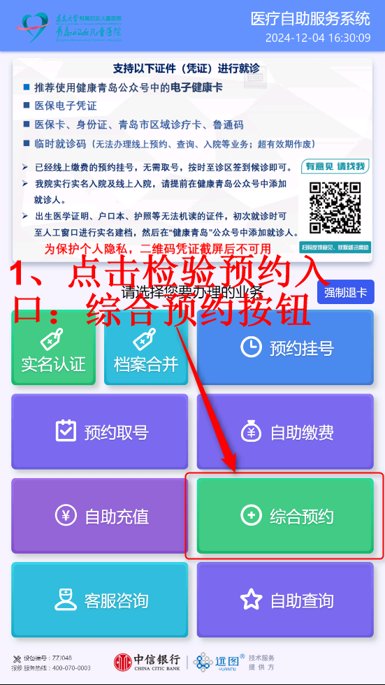 2.目前自助检验项目仅限于18岁以下患者。实名制就诊,请留取准确电话号码,保证出现危急值等情况能及时传达。