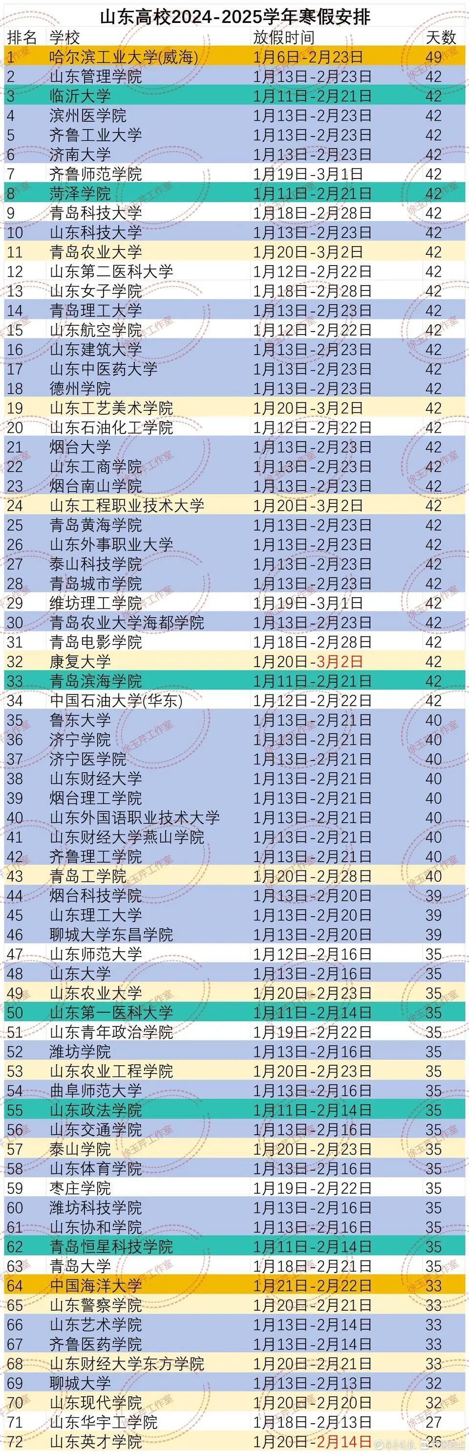 根据高校官方发布的放假通知,并结合学校2024-2025学年校历,记者统计了山东72所普通本科高校的寒假安排情况。