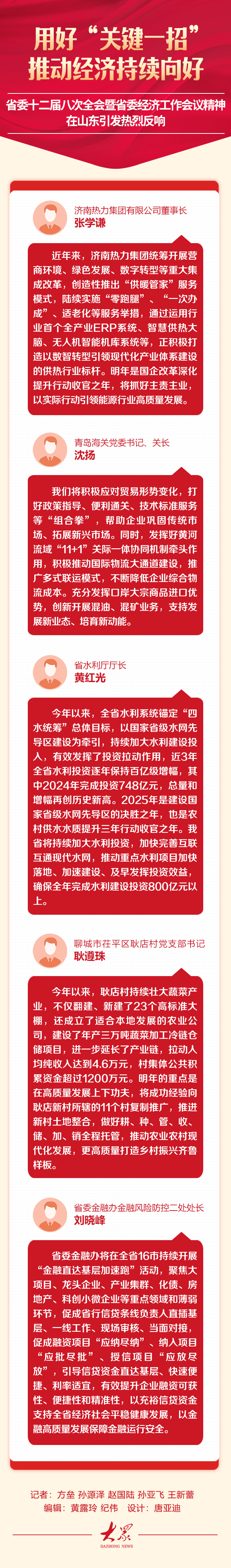 12月24日至25日召开的省委十二届八次全体会议暨省委经济工作会议提出,新一年的经济工作重点在“提振消费、提高投资效益”“推进重点领域改革落地”“打造高水平对外开放新高地”等十个方面聚焦用力。全省广大党员干部表示,要奋发有为、全力以赴,将会议各项安排部署不折不扣落到实处,推动经济持续稳健向好、进中提质。