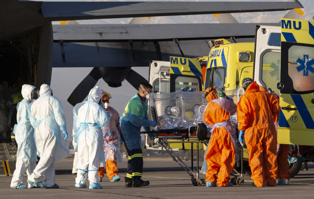 5月22日,在智利圣地亚哥一处空军基地,工作人员将首都大区的新冠重症患者送上空军运输机。他们将被运往周边城市,以分散首都大区医院压力。新华社发