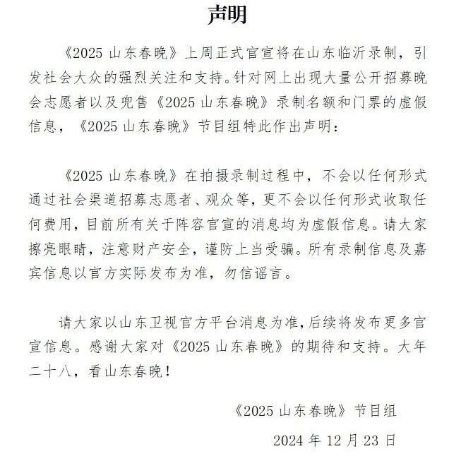 《2025山东春晚》上周正式官宣将在山东临沂录制,引发社会大众的强烈关注和支持。针对网上出现大量公开招募晚会志愿者以及兜售《2025山东春晚》录制名额和门票的虚假信息,《2025山东春晚》节目组特此作出声明。春晚节目组提醒广大网民不要相信、谨防受骗。