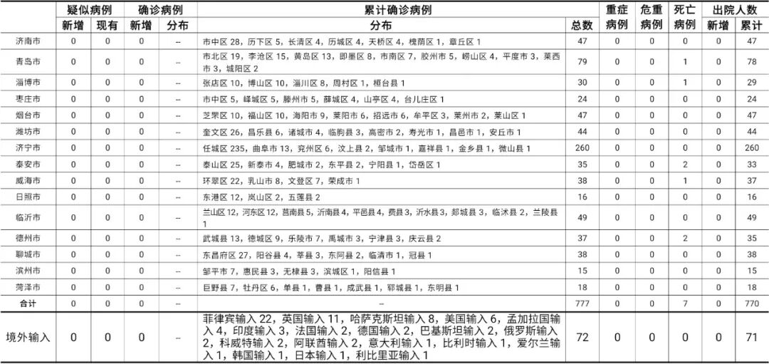 山东无新增本地疑似病例、确诊病例。累计报告确诊病例777例,死亡7例,治愈出院770例。