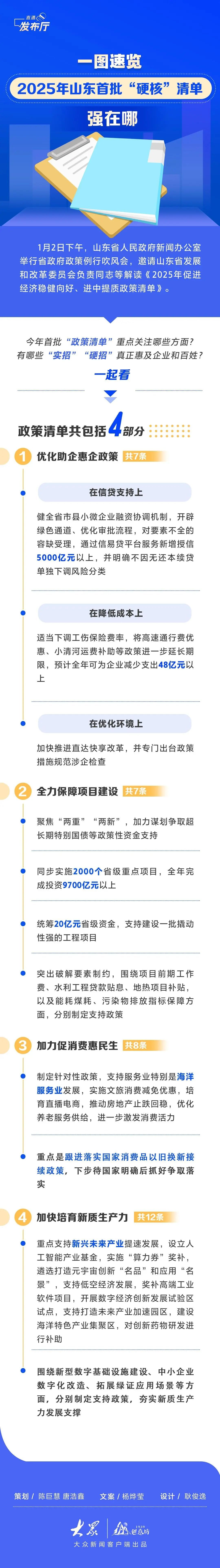 2025年工作日第一天,1月2日下午,山东省政府新闻办举行省政府政策例行吹风会,解读《2025年促进经济稳健向好、进中提质政策清单》(以下简称《政策清单》)。