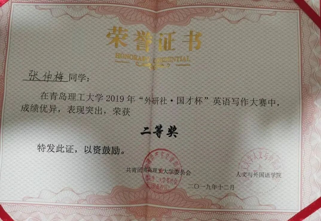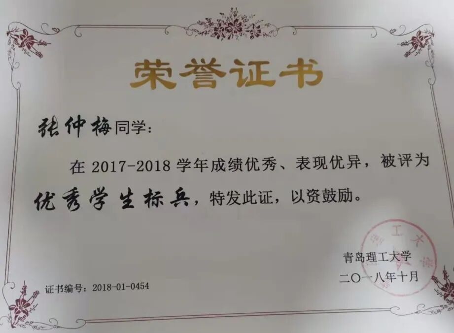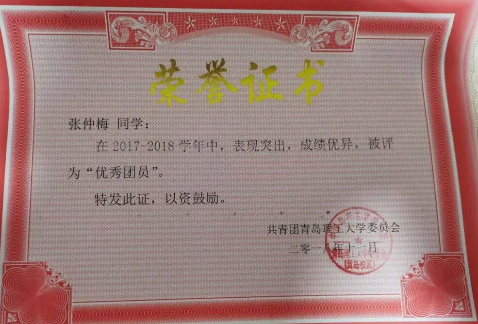 张仲梅的专业成绩及综合素质排名均位列班级前茅(2/40),获得“外研社杯”英语写作大赛三等奖,“外研社杯“英语词汇大赛三等奖,顺利通过了大学英语四六级及计算机二级考试,获得2017-2018年度学年国家励志奖学金,获得“优秀团员”“优秀学习标兵”的荣誉称号。