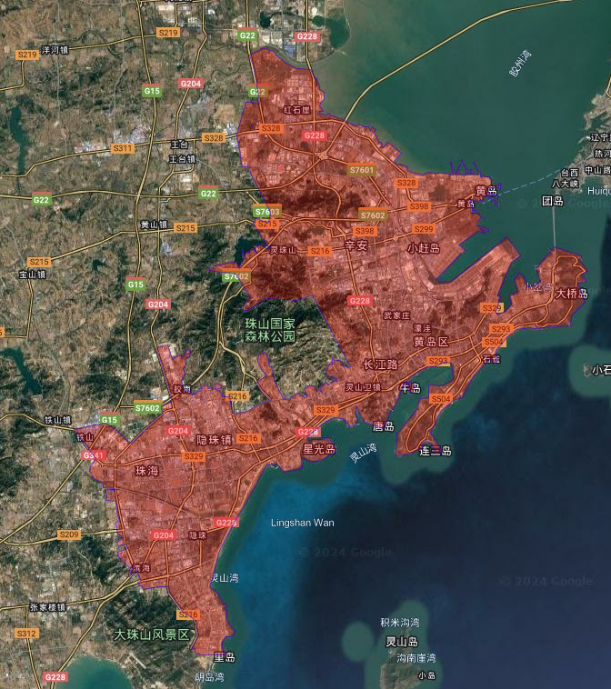 中国石油大学古镇口校区东侧海基线开始沿顺时针方向—海军路—高峪村(含)—山川路—映山红路—石门寺路—滨海大道—海西路—大珠山南路—海西支路—海西路(含峡沟村、明月海洋科技园)—凤玉路—玉泉路—风河北路(含孟家庄村)—铁橛山路—海西三路—东岳西路—菊花山路最东端与玉锦路连接线—玉锦路—双凤山路—珠山北路—背儿山路—204国道—石寨山路(含青岛海创小镇)—凤凰山路(含王家河岩村、郑家河岩村)—背儿山路(含安口村、薛家岭村、水城村)—水城路(含冯家岭村、兰西社区)—泰发路—两河支路—两河路—胶州湾东路(含北高家庄村、崮上村、隆和大溪谷、清华青岛艺术与科学创新研究院、瑞源未来城、开山口村、康大江山樾、毛家山村、齐鲁之间)—青岛小镇东侧界墙(含青岛小镇)—富春江路(含卧龙山文化陵园以南区域)—昆仑山路—香江路—锦江路—昆仑山路—京信电子有限公司以南—老寨山路—辛安河路—前湾港路—龙湖原山西侧—怀玉山路—云台山路—双泊河路—幸福小镇西侧-2 号疏港高速—团结路—生态园环路连接线—颍河路—昆仑山路—青兰高速—东屯社区—昆仑山路—茂山路—龙泉戚家村村西—云台山路—海岸线(洋河入海口)。