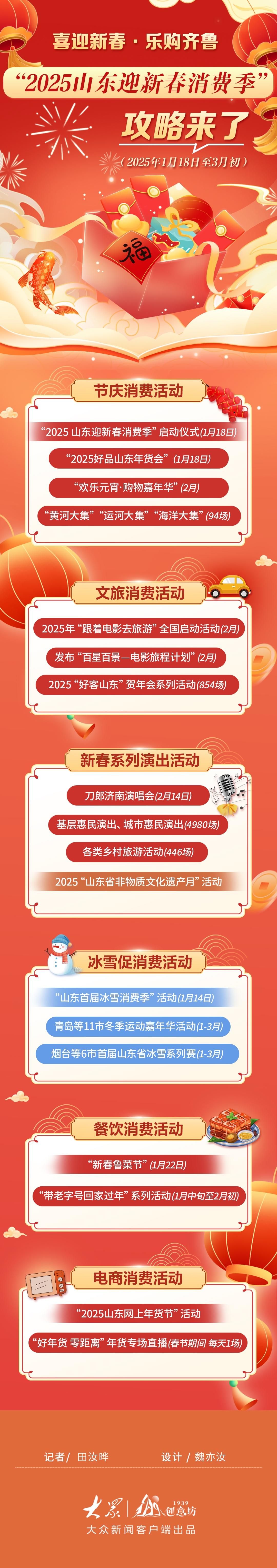 “2025好品山东年货会”“跟着电影去旅游”“新春鲁菜节”“山东首届冰雪消费季”,2月14日刀郎济南演唱会……点击攻略,您感兴趣的都在这!