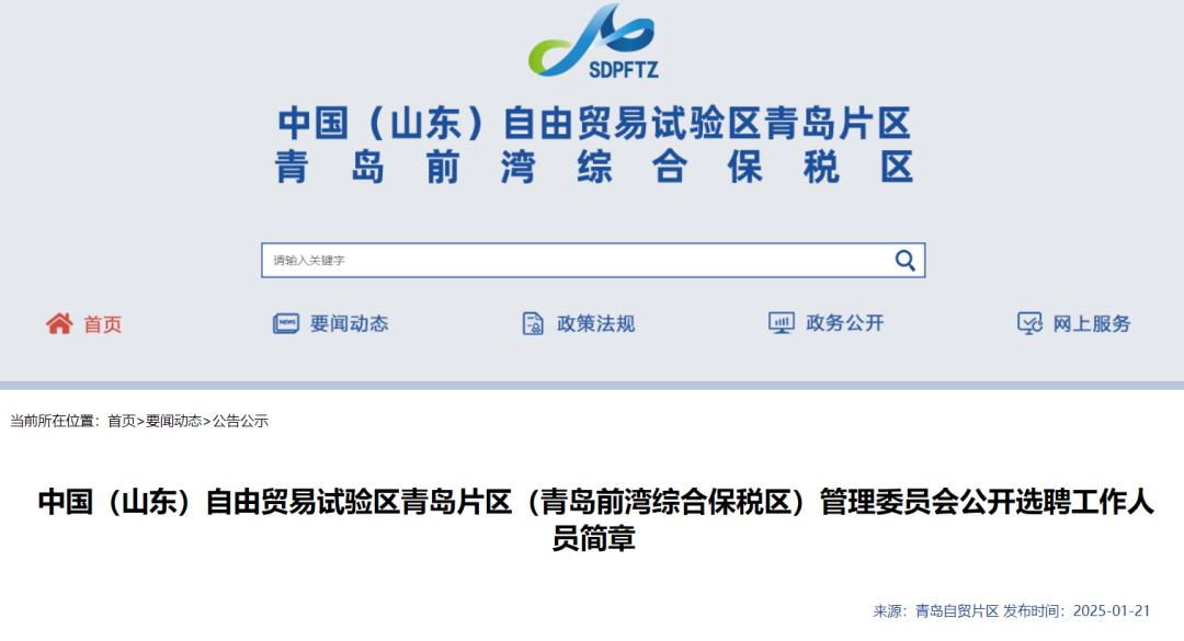 为进一步扩大选人视野,根据工作需要,中国(山东)自由贸易试验区青岛片区(青岛前湾综合保税区)管理委员会拟公开选聘35名管委会工作人员。