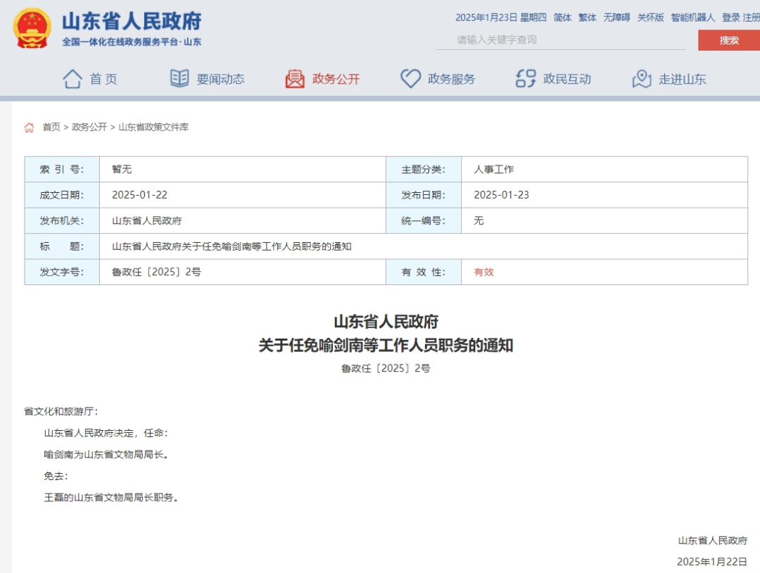 山东省人民政府决定,任命:喻剑南为山东省文物局局长。