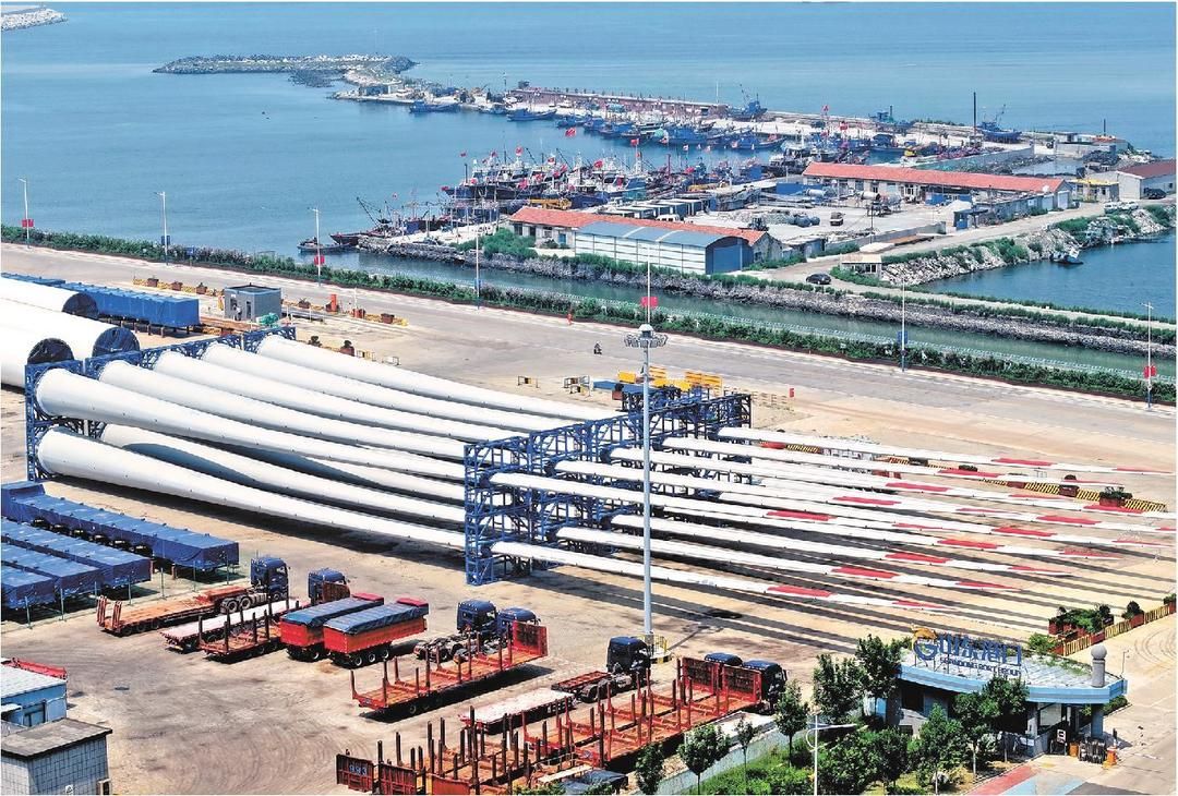 近年来,山东持续加大海洋工程装备自主研发力度,高端装备制造不断取得新突破,海洋风能装备制造能力不断提升,优势海工装备产业集群正在形成。图为山东港口烟台港蓬莱港公司码头待运输的风电设备。(新华社记者李紫恒报道)