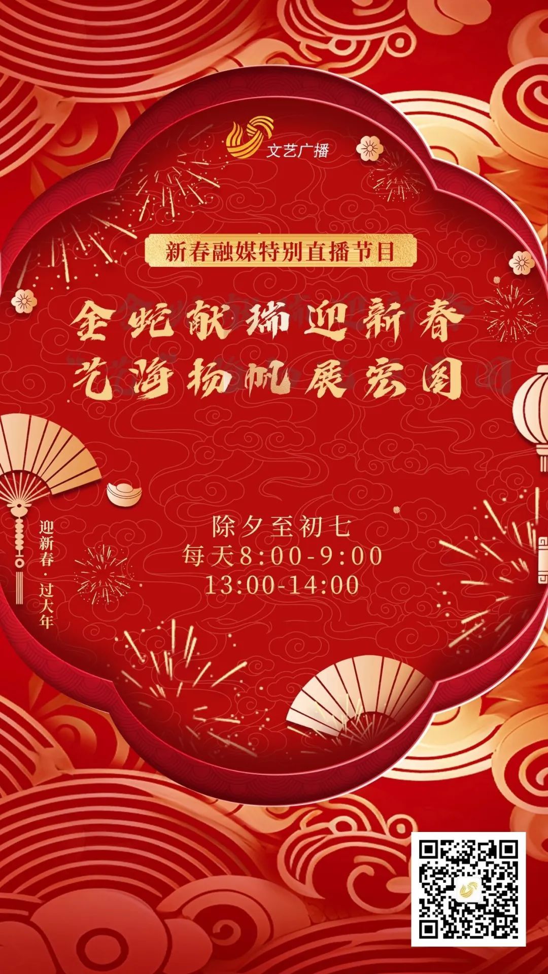 山东广播电视台文艺广播围绕“曲山艺海 美好生活”频道定位,春节期间计划推出“金蛇献瑞迎新春,‘艺’海扬帆展宏图”主题策划,除夕至初七每天8:00-9:00,13:00-14:00播出。