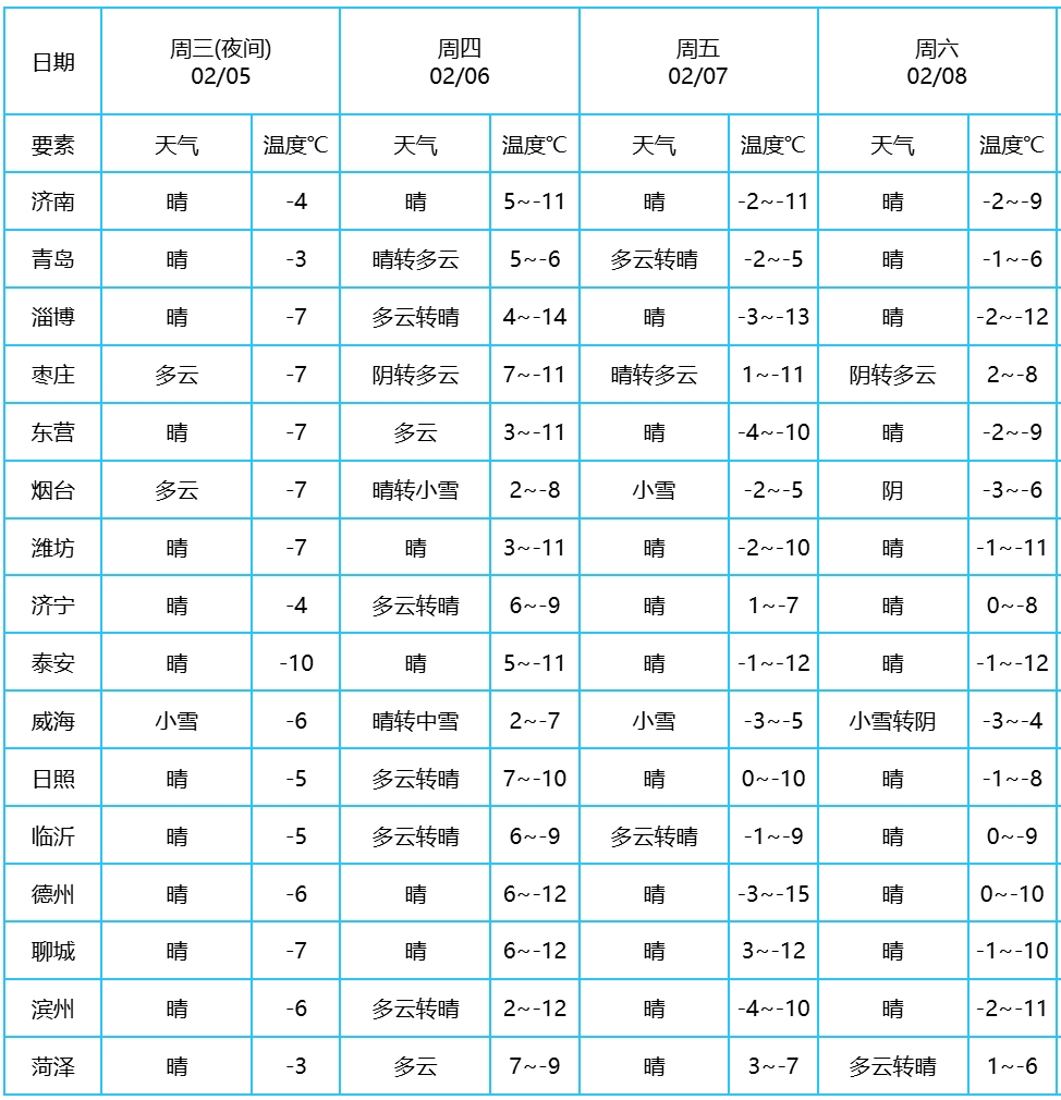 最低气温:鲁中山区-12℃左右,沿海地区-8℃左右,其他地区-10℃左右。