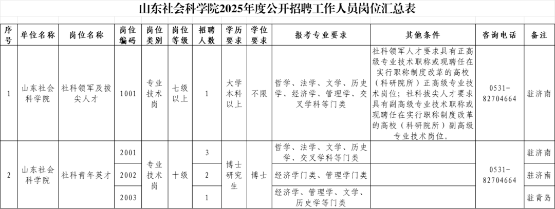 山东社会科学院拟面向社会公开招聘高层次人才1名以及优秀博士研究生6人,具体岗位及条件详见《山东社会科学院2025年度公开招聘工作人员岗位汇总表》。