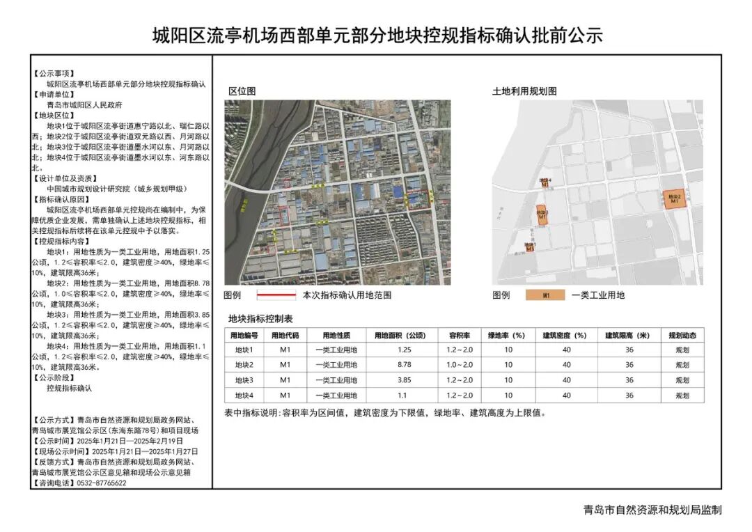 近期,青岛市自然资源和规划局官网发布“城阳区流亭机场西部单元部分地块控规指标确认批前公示”,控规指标确认因是城阳区流亭机场西部单元控规尚在编制中,为保障优质企业发展,需单独确认上述地块控规指标,相关控规指标后续将在该单元控规中予以落实。