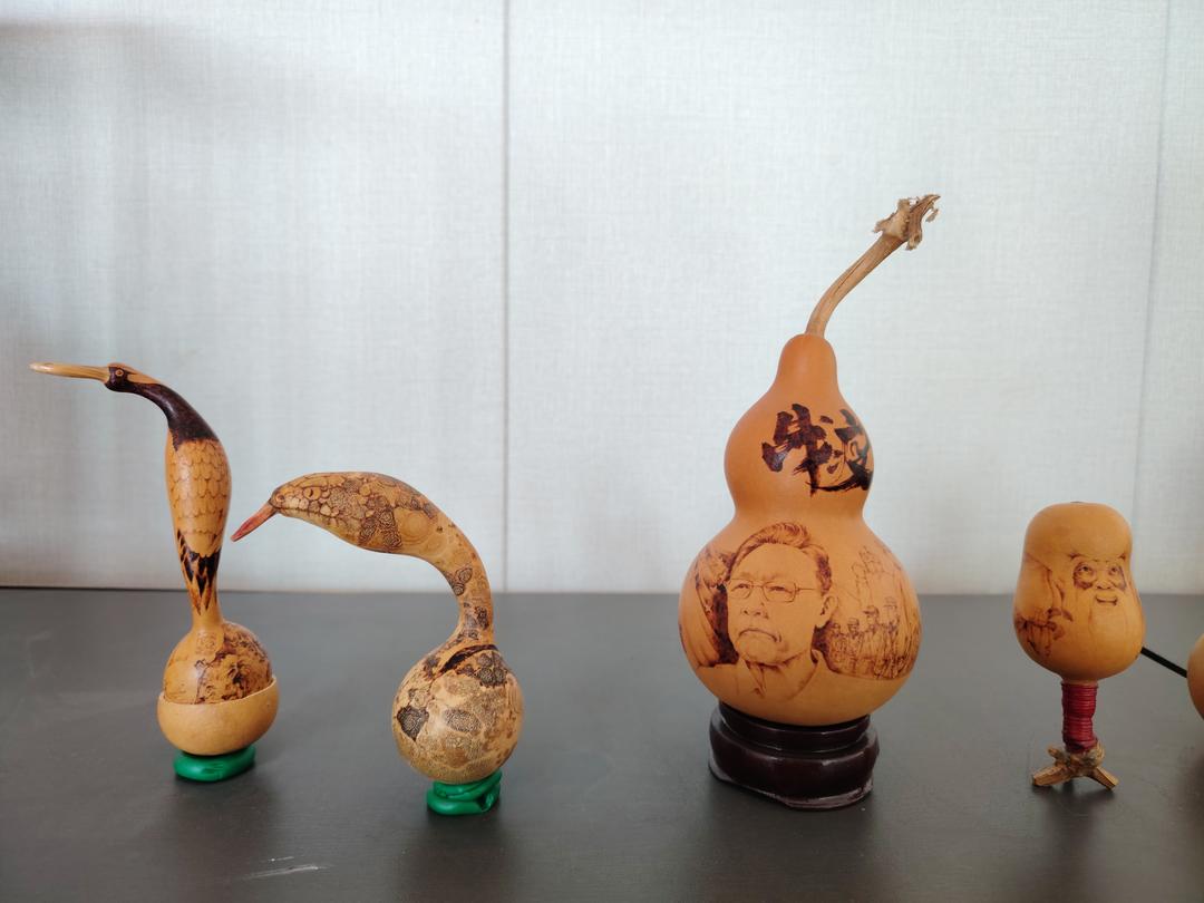“这个面塑,是西游题材,这几个烙画葫芦,我是专门在大集上找的长势奇特的葫芦作画……”在沈靖宇家中客厅,记者见识到了何为“技多不压身”。除了墙绘,沈靖宇还是个“多面手”,柜子上摆满了他的手工艺品,笔芯微雕、面塑、烙画葫芦等赏心悦目。