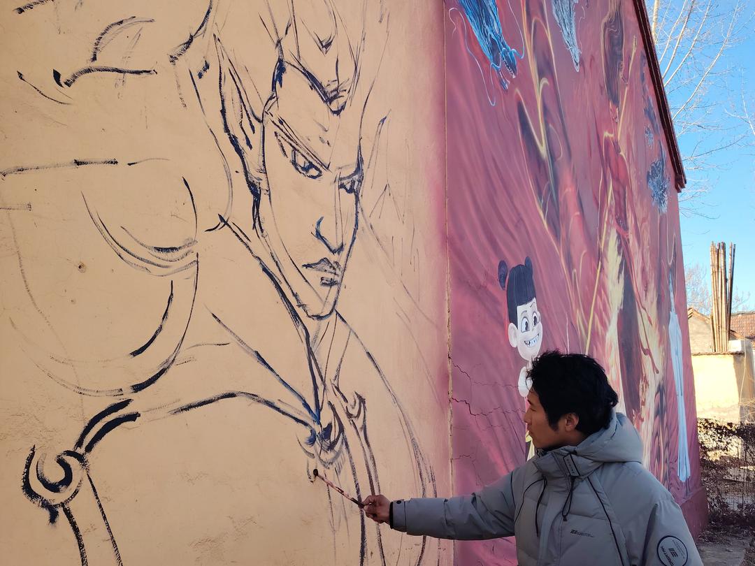 在2025年春节之前,沈靖宇便开始制作哪吒墙绘。