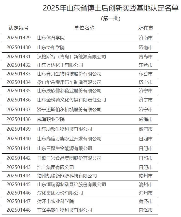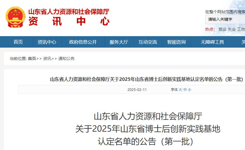 2月11日,记者从山东省人力资源社会保障厅获悉,该厅日前发布了《关于2025年山东省博士后创新实践基地认定名单的公告(第一批)》。